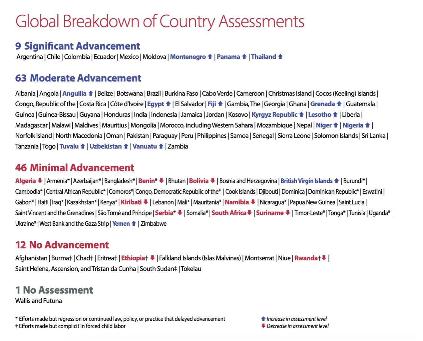 Country progress is uneven. In 2024, nine countries - including Argentina, Mexico, Thailand, and Moldova - achieved the highest assessment of Significant Advancement, showing progress in education laws, enforcement systems, and coordination. However, 63 countries were rated Moderate Advancement, 46 Minimal Advancement, and 12 received No Advancement, often due to failure to take meaningful or systemic steps to prevent child labour
