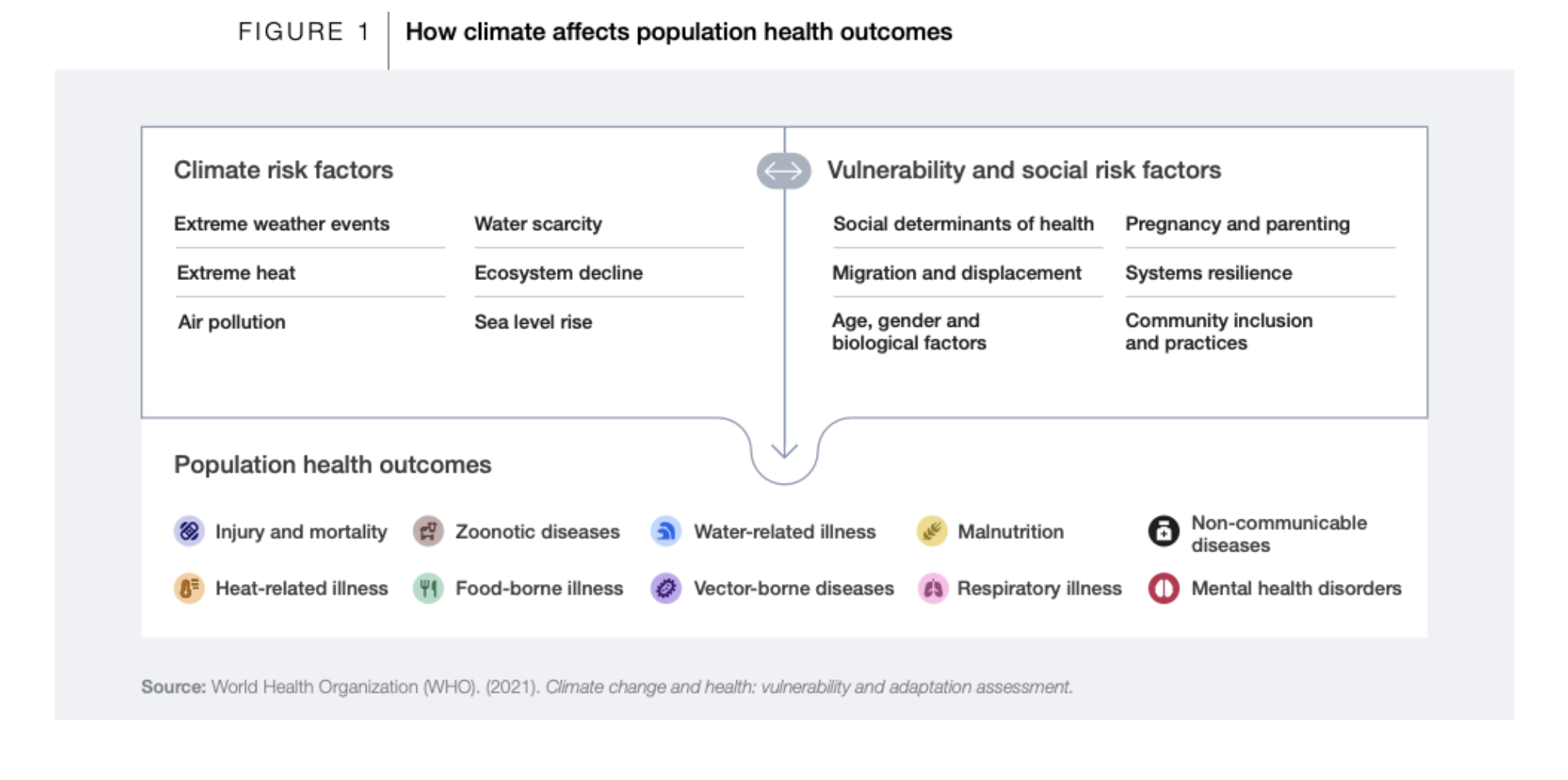 The health impacts of climate change is already significant, and will only grow in magnitude: The report identifiesfour highly exposed sectors to climate-driven health risks (i.e., food and agriculture, built environment, health and healthcare, and insurance). Chronic climate stressors undermine the foundations of good health (e.g., clean air, safe water, stable temperatures, sufficient food, secure shelter), while extreme weather events directly threaten health. If left unaddressed, climate change could result in 14.5 million excess deaths and $12.5 trillion in economic losses by 2050. Climate-driven health risks disproportionately impact the most vulnerable and disadvantaged, including women, children, the elderly, poor communities, migrants or displaced persons, and those with underlying health conditions. For example, 56% more health-related deaths occurred among women than men in Europe between 30 May and 4 September 2022. At the same time, these groups lack the resources to adapt to climate change, creating a vicious cycle in which climate shocks deepen existing health and economic inequalities. Climate-driven health risks and outcomes are wide-ranging and can, in some cases, be fatal (see Figure 1 below). Health risks and outcomes include injury and mortality; heat-related illness (e.g., heatstroke and cardiovascular stress); zoonotic diseases (e.g., Ebola and COVID-19); vector-borne diseases (e.g., malaria, dengue, Zika, and Lyme disease); water-related illness (e.g., cholera, typhoid, and dysentery); food-borne illness (e.g., salmonella, E.coli and norovirus); malnutrition; respiratory illness (e.g., respiratory tract infections, pneumonia, asthma, chronic obstructive pulmonary disorder, and lung cancer); non-communicable diseases (e.g., pregnancy complications, adverse birth outcomes, and chronic illnesses); and mental health disorders (e.g., anxiety, depression, and post-traumatic stress disorder).